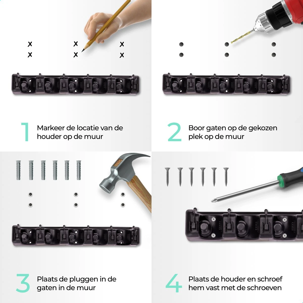 Met 5 houders én 6 slimme haken hoef jij je om troep geen zorgen meer te maken. Zo hang je al jouw bezems, stoffers en dweilen netjes op en heb je aan één ophangsysteem meer dan genoeg. Opgeruimd staat netjes.