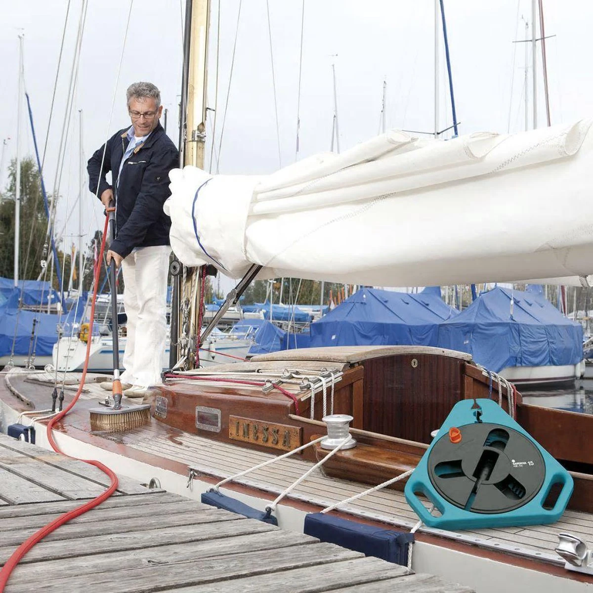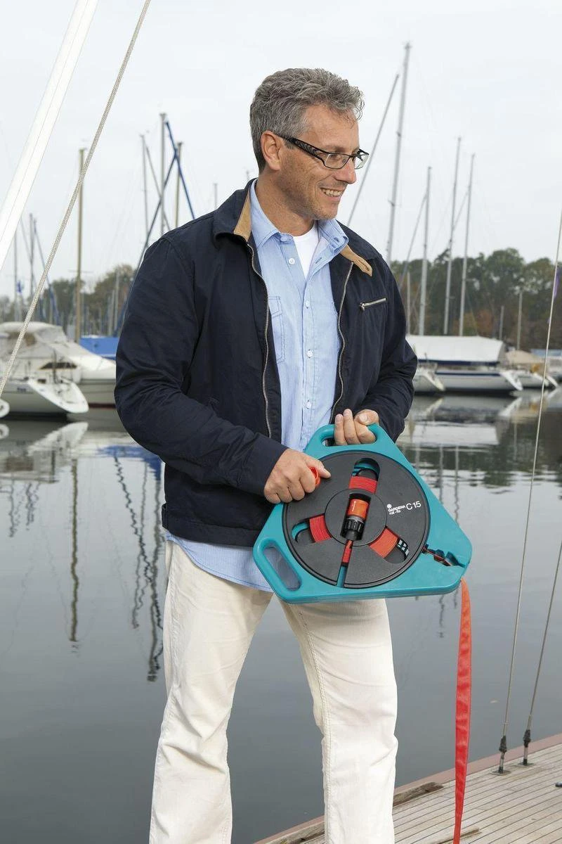 Gardena roll-fix, 15 m platte slang in cassette Licht en compact. Geïmpregneerde platte slang. Met veiligheids automaat die voorkomt dat bij het onopzettelijk onder druk zetten van de nog niet afgerolde slang, de draagcassette stuk gaat. Barstdruk boven 25 bar. Compleet met Original Gardena System aansluitstukken en tuinspuit.