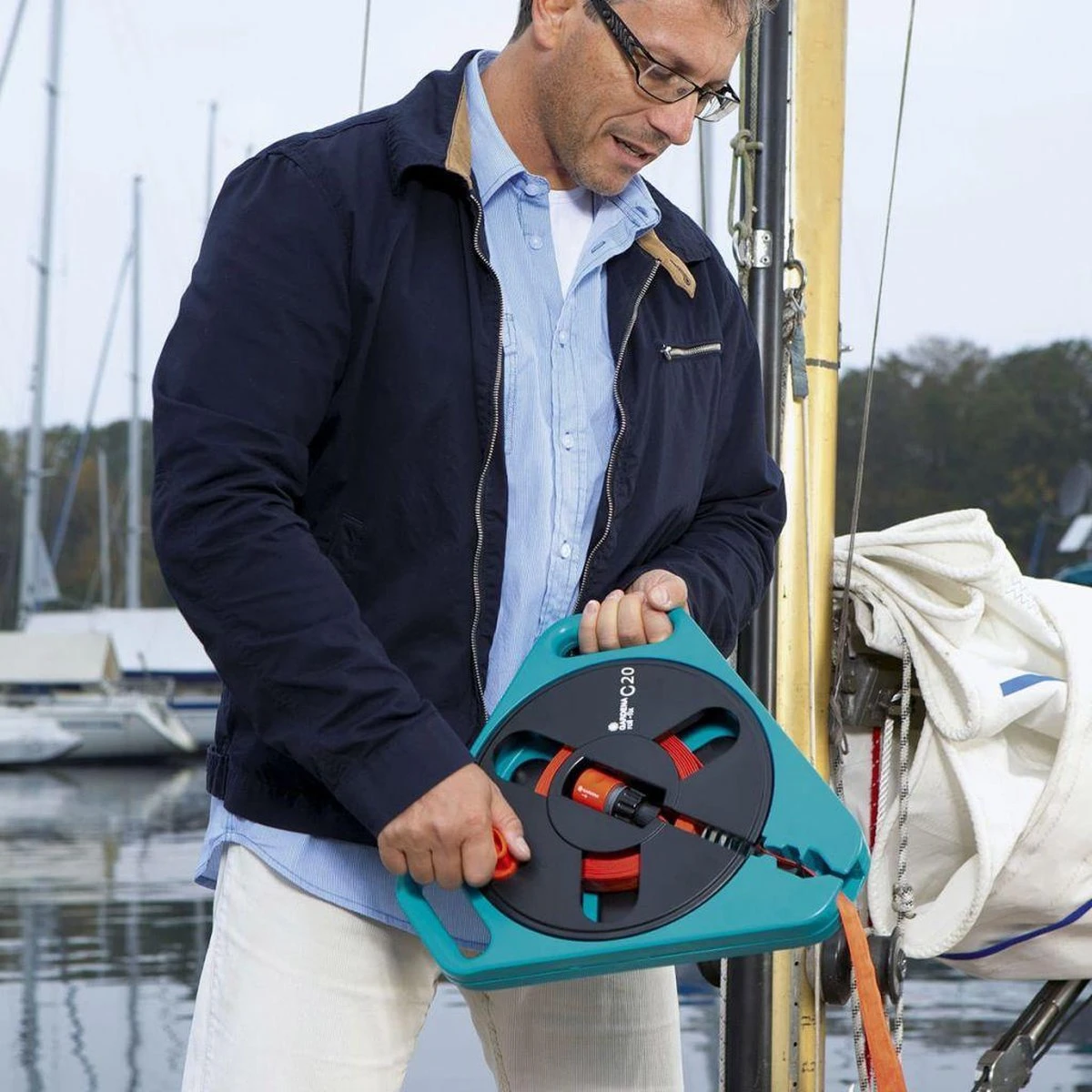 Gardena roll-fix, 20 m platte slang in cassette Licht en compact. Geïmpregneerde platte slang. Met veiligheids automaat die voorkomt dat bij het onopzettelijk onder druk zetten van de nog niet afgerolde slang, de draagcassette stuk gaat. Barstdruk boven 25 bar. Compleet met Original Gardena System aansluitstukken en tuinspuit. roll-fix 20 – 20 m.