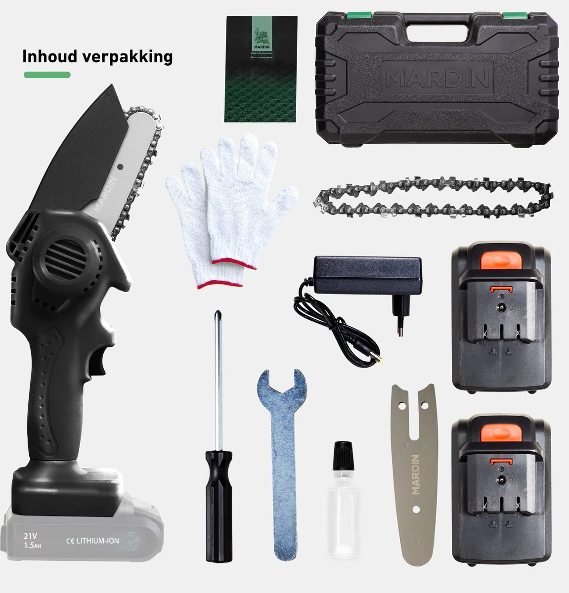 Dankzij de Mardin® Mini kettingzaag – MK-1 heb je nu een handzaag en een kettingzaag-in-1. Dankzij de comfortabele grip, het pistoolachtige-ontwerp en het volledig draadloze aspect, is deze mini kettingzaag een absolute must-have voor iedere doe-het-zelver of professionele klusser. Met een zaaglengte van 10 cm en een zaagsnelheid van 5m/s zaag je hout moeiteloos door. Ook ideaal voor in de tuin!