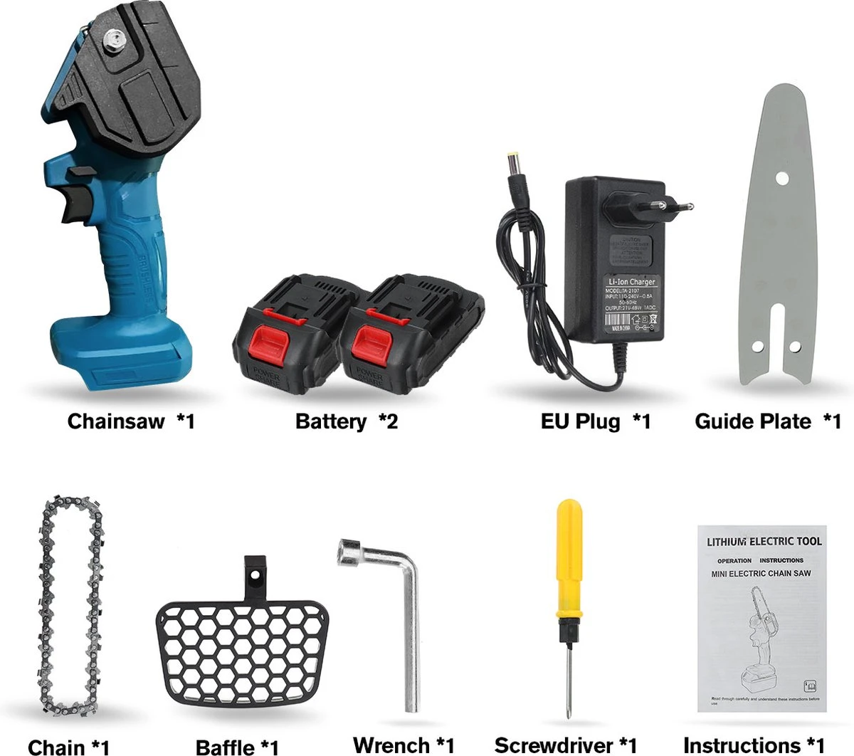 - l Oplaadbare elektrische kettingzaag, lichtgewicht en draagbaar, lange levensduur van de batterij en zal de schors niet beschadigen.
